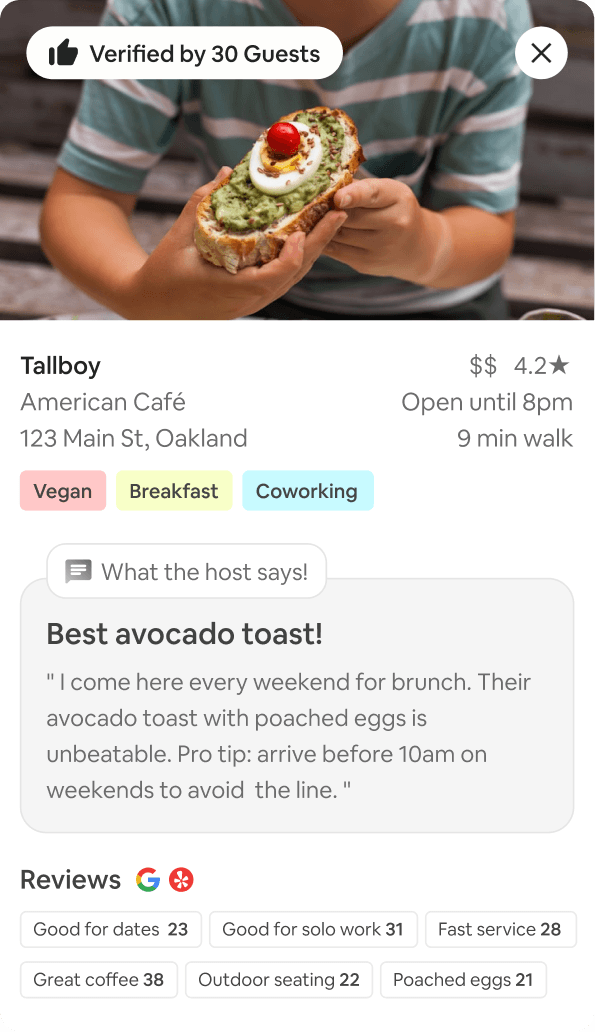 Google Maps has data, but Airbnb has Hosts the locals who know the "best avocado toast" or the "perfect place to co work". We realized we could leverage this human connection to build a trust layer that algorithms simply can't copy.