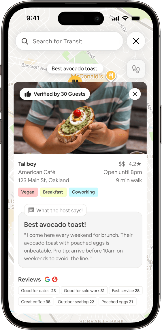 We moved recommendations out of the text description and onto the map. Instead of generic pins, we used Contextual Speech Bubbles (e.g., "Best avocado toast!") to highlight value rather than just location.